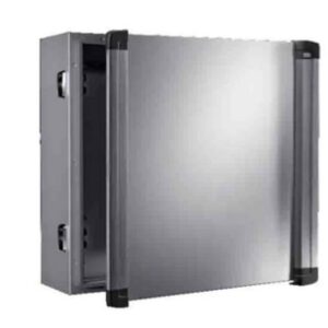 El armario de control sobre base AX con manijas, de chapa de acero, con recorte para brazo portador Ø 130 mm adecuado para brazos portadores CP 60/120/180, acceso de mantenimiento por la parte delantera, panel frontal de aluminio fácil de desmontar para mecanizar, índice de protección IP55.